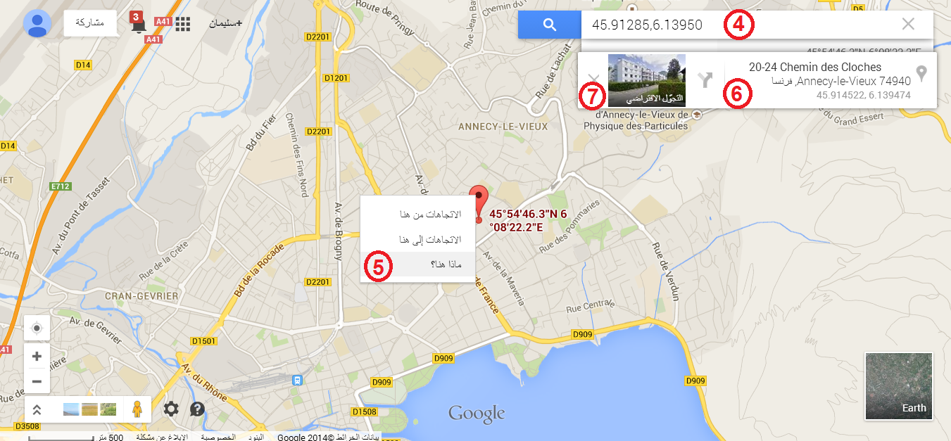 4- تستطيع أن تذهب في الأجهزة الكفية إلى تطبيق خرائط (googlemaps) مثلاُ وتضع فيه الإحداثية المنسوخة فتظهر لك على الخارطة. 5- ومنها تستطيع أن تضغط على زر الفارة الأيمن على مكان الاحداثية فتظهر (ماهذا).